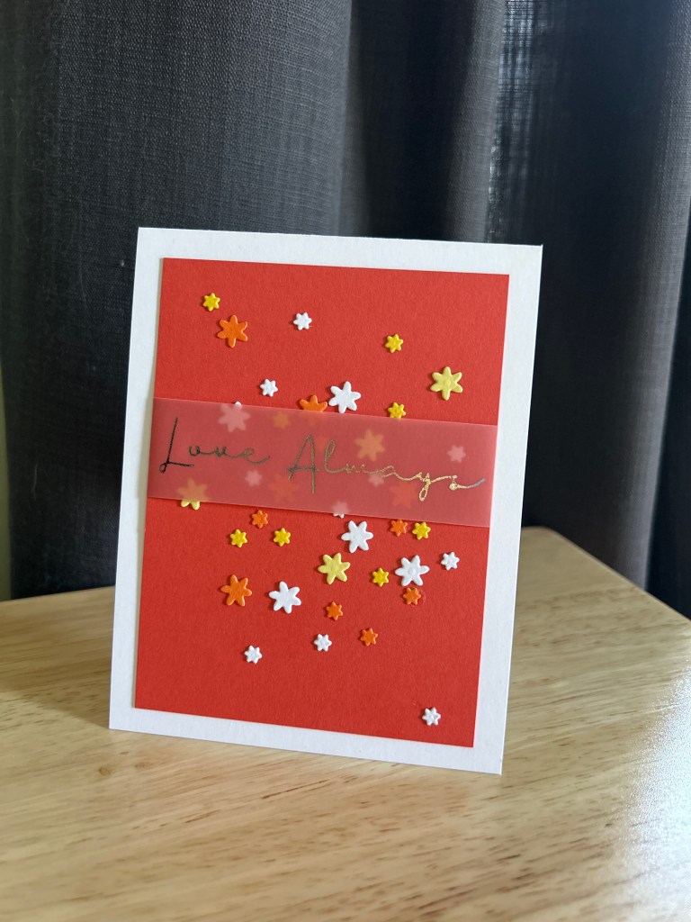 This one started as a loose scatter of flowers on a C&9th pimento cardstock I just got. It felt light and playful right away — like floral confetti.