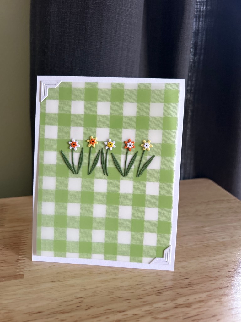 The gingham paper came from a bouquet of tulips I received from a friend. I laminated it and turned it into a card panel, then added a simple row of tiny flowers and stems.