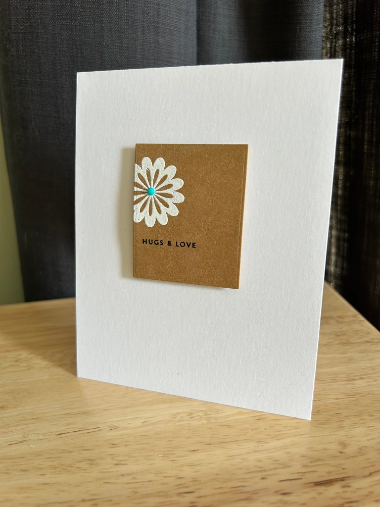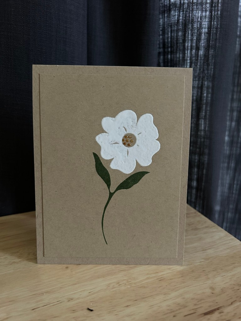 A single white flower heat embossed (twice) on kraft cardstock, paired with deep green leaves and tiny gold glittery drops in the center, lets the design stand on its own. I chose to leave the front sentiment-free so the flower could remain the focal point.