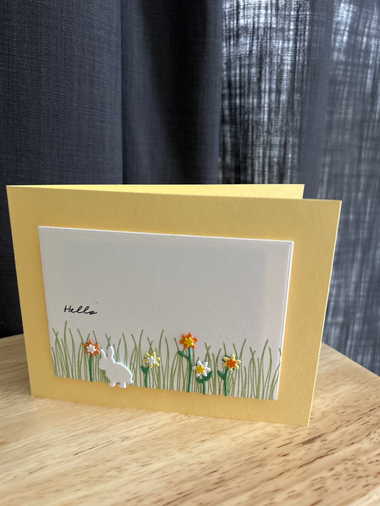 For the first card, I masked off a section of the card and blended a bright yellow. Then I stamped the flower outline across the panel to create a simple black pattern.