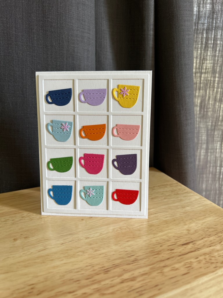 This week, I pulled out those tiny cups and challenged myself to make a series of cards, all built from scraps that had been waiting more than a year. I started with a grid pattern because it felt natural, neat rows of mugs, small pieces coming together in harmony. But then came the real creative work, figuring out how to make each card feel distinct.