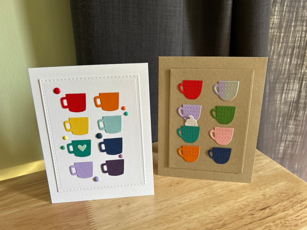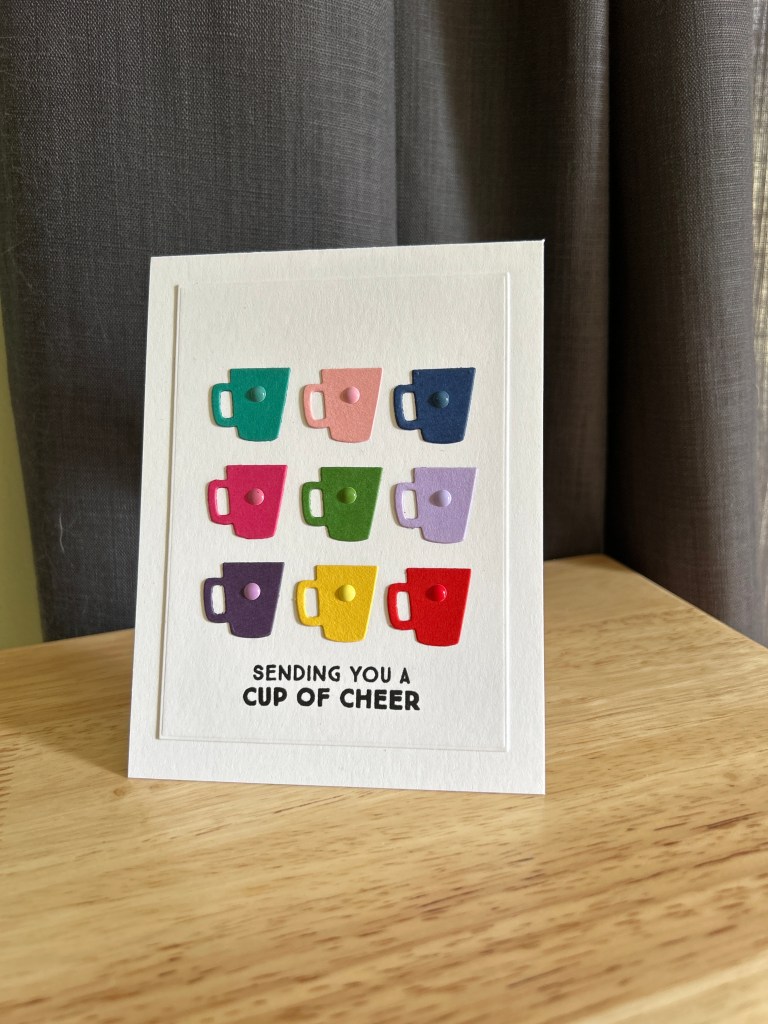 A year and a half ago, on vacation in Maine, I packed my tiny scrap stash and a handful of small dies. No stamps, no adhesives, no embellishments, just my die cutting machine and the quiet rhythm of cutting shapes. One of those dies was Newton’s Nook’s mug set. I cut out mugs to my heart’s content, challenging myself to see how many I could get from each piece of leftover scrap. They were bright and mismatched and delightful, and then I tucked them away in one of those plastic gum containers I nicked from my son, thinking I’d use them someday.