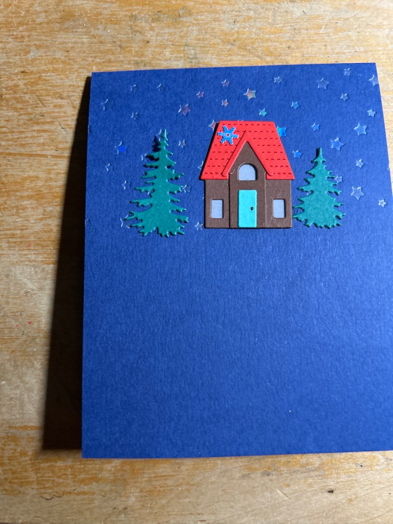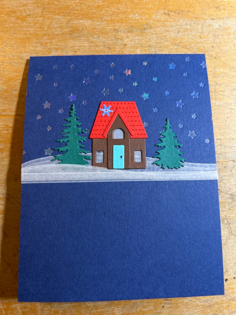 I laminated the gold to preserve the crinkle and light-catching texture. I then die-cut a simple evergreen silhouette from deep green cardstock and used some gold gilding flakes (I was inspired by a holiday card someone had sent us!). The gold peeks through the tree like light caught in branches, irregular and organic. No embellishments, no sentiment on the front. The material carries the meaning.