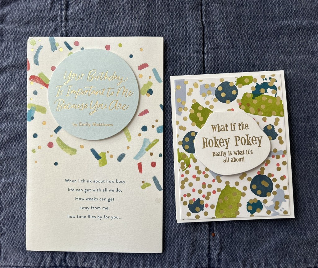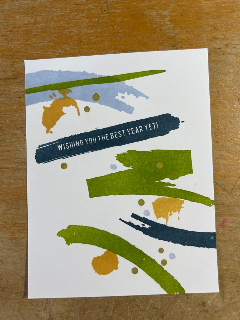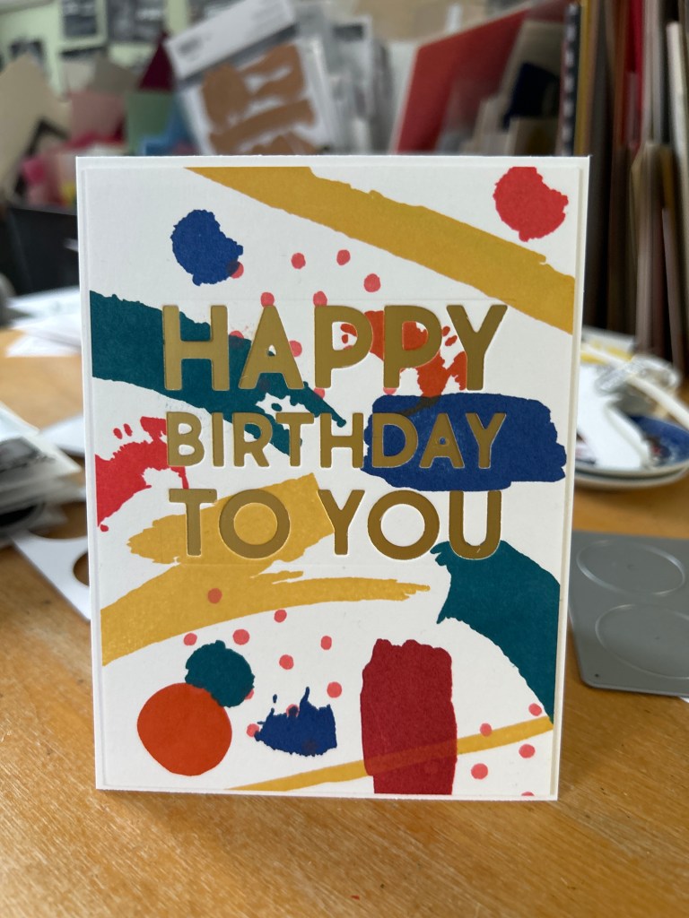 I received a birthday card from my aunt this year that immediately caught my eye. It featured a joyful watercolor background filled with playful brushstrokes in mustard, teal, navy, and red. The color story felt energetic but cohesive, and I knew I wanted to explore that palette in my own way.